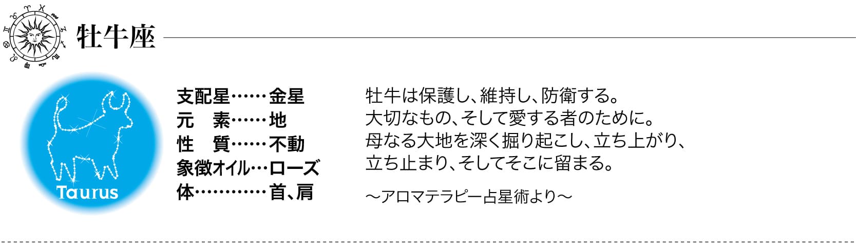 【使用精油】 ローズ、ゼラニウム、パチュリ、サンダルウッド、ラベンダー、レモングラス、匂い菫、蜜桃、ヒヤシンス 牡牛座の人は、物質的な所有物であれ、才能や能力といった無形資産であれ、その価値といったものに対して鋭い識別力を持つと同時に、食べ物やワイン、セックスなどの肉体的な快楽すべて好みます。芳しい香りのもたらす感覚的な喜びを重視し、敏感でマッサージを施す腕と才能を持ってる場合が多くみられます。「美と芸術」を象徴する金星が支配星なので、通常とても優れた芸術的なセンスに恵まれ、美容、服や住環境、音楽や絵画などの分野でその才を発揮します。 牡牛座の人は我慢強く、固い決心で粘り強く仕事やプロジェクトに取り組み、完成を見届けるまで頑張ります。地の星座で不動宮であるため、ガンコな面もあります。 ローズは女神(金星=アフロディーテ)への捧げ物。高級品や快楽という牡牛座の嗜好を体現しています。最高の媚薬。