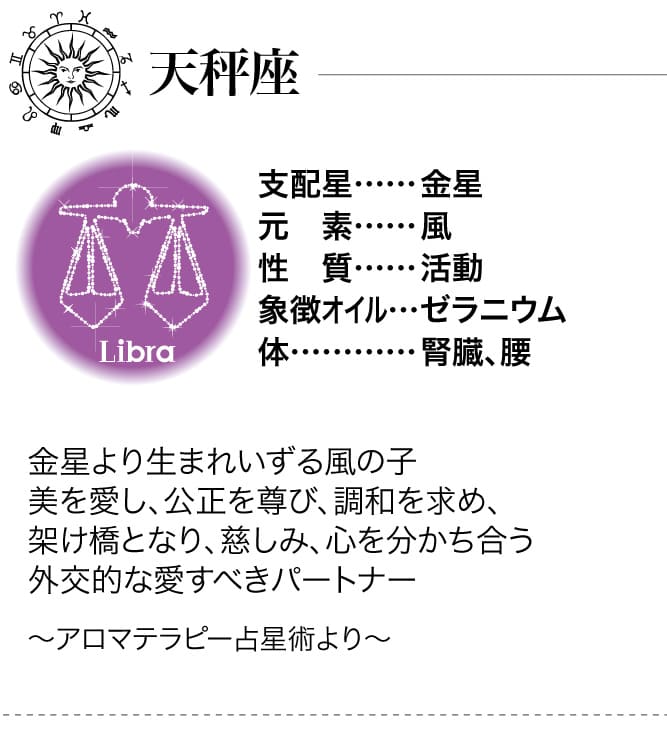 【使用精油】 ゼラニウム、ローズ、サンダルウッド、金木犀、ローズウッド、オレンジ、野菊、ラベンダー、山茱萸(サンシュユ) 古代エジプトでは、人が死んで冥界にいくとき、通らなければならない所があり、そこには門番としてアヌビス神がいます。そして2つのことを聞きます。 「生きてるとき喜びをもったか?」 「人に喜びを与えたか?」 心臓を天秤にかけ、もう一方には真理の女神マアトの羽根(真実の羽根)が入っています。 魂が罪で重いと傾くようになっていて、その秤の目盛りを見つめるアヌビス、その先には冥界の王オシリスがいます。この様子は、「死者の書」に表わされています。 天秤座にとって、正義、公正さ、バランスが非常に重要と捉えます。 十二宮の中の調停者なのです。 支配星は、美、芸術そして身体的快楽を愛する金星です。 風のエレメントである天秤座の人たちは、自由で美しいものを見分けるセンスを持っています。また、天秤座は一番‘社交的’な宮で、パートナーシップのハウスです。バランス感覚を持ち、社交的で魅力的な人々です。